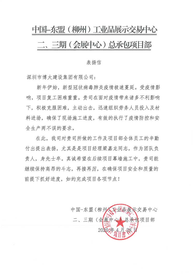 博大建設(shè)集團(tuán)在中國-東盟(柳州)工業(yè)品展示交易中心二、三期(會展中心)項(xiàng)目中,積極克服疫情造成的困難,主動(dòng)出擊,確保了現(xiàn)場施工進(jìn)度,有效的執(zhí)行了疫情防控和安全生產(chǎn)兩不誤的要求,獲得客戶表揚(yáng)。