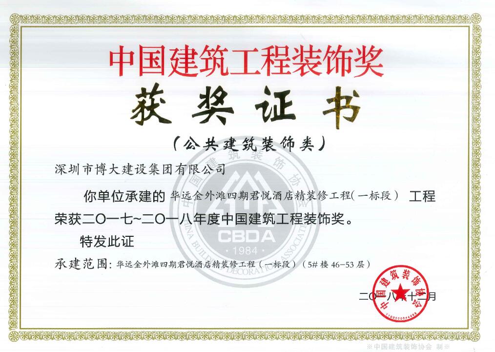 博大施工團隊?wèi){借豐富的五星級酒店裝飾裝修經(jīng)驗,相繼克服了材料二次運輸及周轉(zhuǎn)繁瑣、施工空間受限、垂直運輸、供材的不確定性等困難,完美達到裝修預(yù)期效果,得到客戶和行業(yè)的高度認(rèn)可,榮獲中國建筑工程裝飾獎。