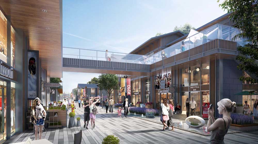 商業(yè)街外立面選用仿木型材及鋁板,屋頂采用琉璃瓦,將仿古建筑的歷史韻味和科技感、時尚感融為一體。