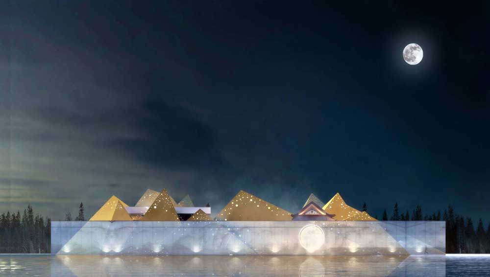圖7為藝術(shù)展覽館。以月影為主題,形似金字塔,外墻采用古銅色鋁板密拼做法,四周外墻采用傳統(tǒng)的框架式玻璃幕墻。在月光下塔體倒映在玻璃外墻上形成像山脈一樣的山水畫,體現(xiàn)出了設(shè)計的藝術(shù)色彩。