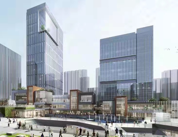項目位于重慶市渝北區兩江國際商務中心,設計理念源于山城劇場的概念,將商業打造成開放式的街區。博大負責1號樓、2號樓、商業裙樓的幕墻施工,幕墻系統包含框架式玻璃幕墻、夾具式玻璃幕墻、鋁板幕墻、玻璃雨篷等。